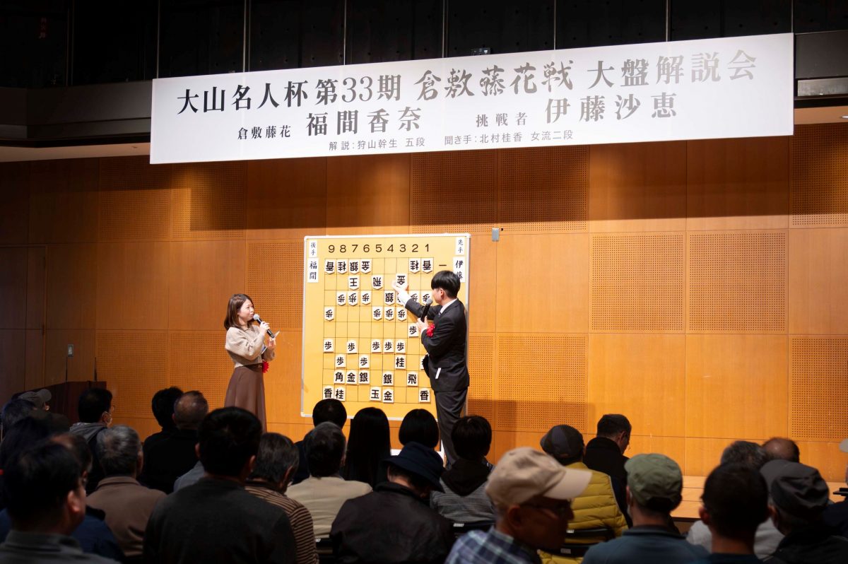 15・16日に開催した大盤解説会では、解説の狩山幹生五段と聞き手の北村桂香女流二段に多くの将棋ファンが耳を傾けていました。
