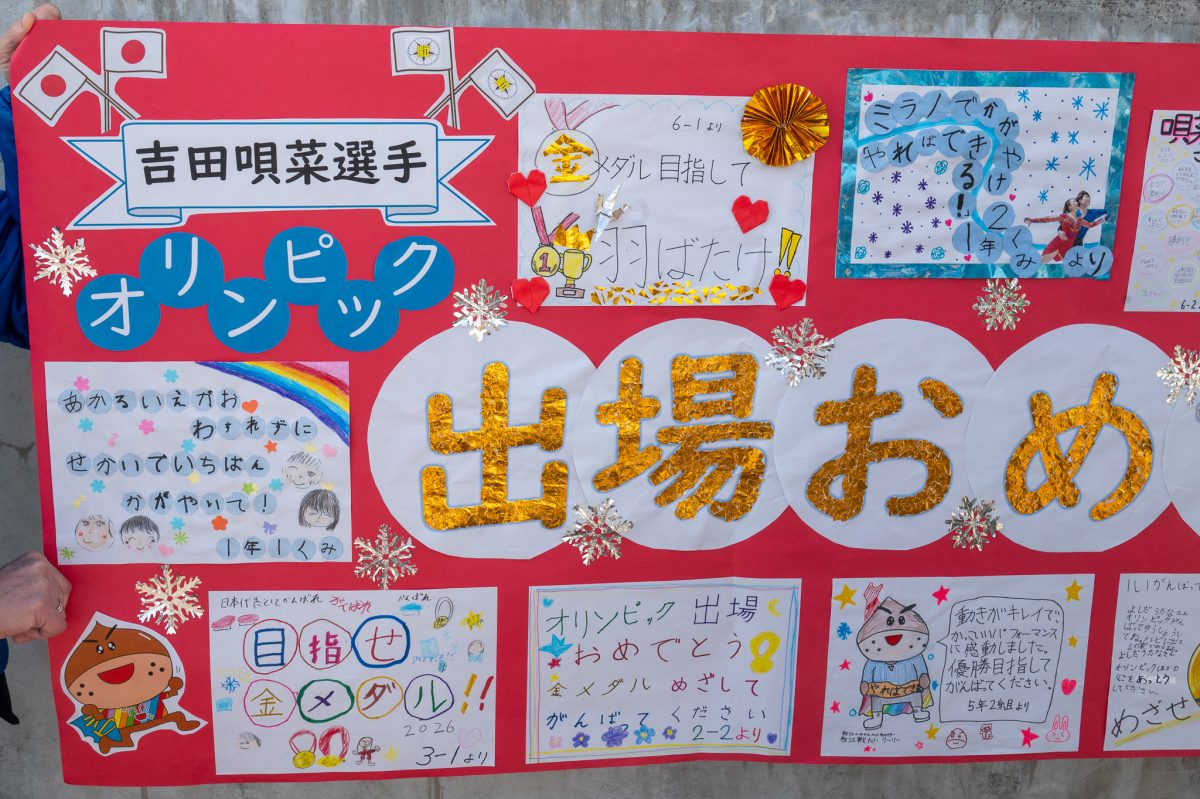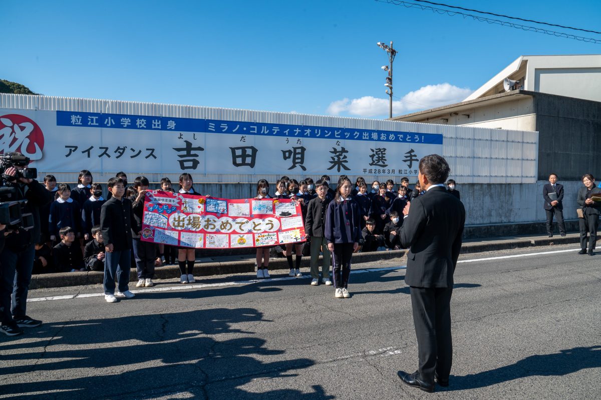 2月3日(火)に倉敷市立粒江小学校で吉田唄菜選手を応援する会が開催され、地元有志の方が準備した横断幕の披露や、吉田選手のお父さんへの全校児童による寄せ書きの贈呈、吉田選手への応援メッセージ撮影などが行われました。
